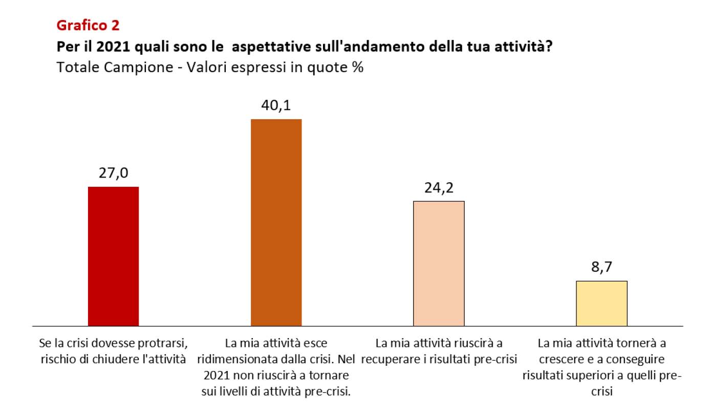 Passando dal generale al particolare non cambia, in sostanza, la situazione. A fronte di un 32,9% complessivo di imprese che nel 2021 ritiene di crescere (l’8,7% presume un incremento sui risultati pre-Covid) o perlomeno di recuperare le perdite accumulate nel 2020 (24,2%), si erge un predominante 67,1% scarsamente o per nulla fiducioso nel breve periodo. In particolare, il 40,1% delle imprese intervistate, dopo avere accusato un forte ridimensionamento nel 2020, è convinto che nel 2021 non tornerà ai livelli precedenti. E il residuo 27% ha addirittura paura di cessare l’attività nei prossimi mesi.
