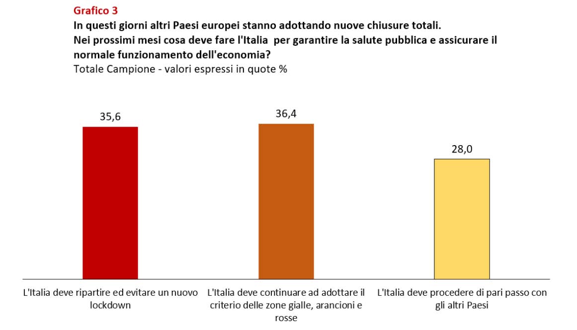 Il 35,6% del campione ritiene invece che, a questo punto, le ragioni dell’economia siano prioritarie e debbano essere evitati nuovi confinamenti. Il 28%, infine, chiede che l’Italia proceda nel solco degli altri Paesi europei, al fine principale di mantenere invariata la posizione competitiva nazionale.