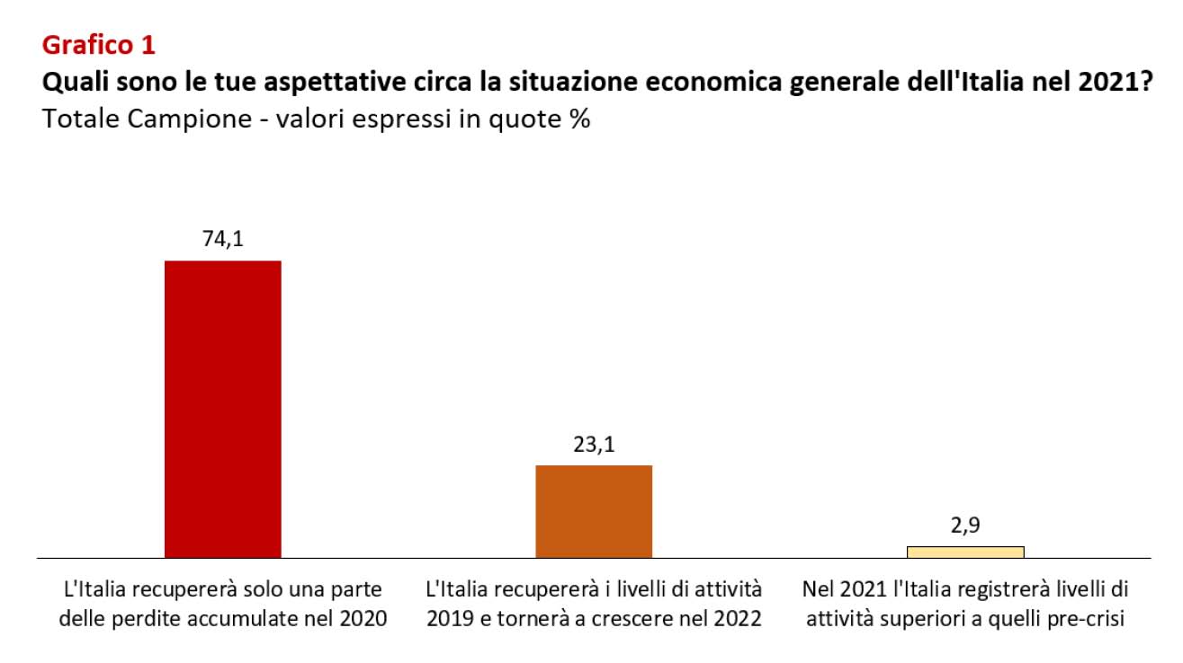 Quale 2021 prevedono gli imprenditori sotto il profilo economico italiano? Il 74,1% delle imprese coinvolte nell’indagine immagina che la caduta del prodotto interno lordo tricolore registrata nel 2020 possa essere recuperata solo parzialmente nel 2021. Il 23,1%, invece, è ottimista e crede che l’Italia sia in grado di riconquistare rapidamente i livelli pre-Covid. Giudizi influenzati dal settore operativo delle imprese. I comparti che il confinamento ha fermato (costruzioni) o ha rallentato in maniera sensibile (dal turismo ai servizi per la persona) propendono infatti per una visione negativa, occhiali rosa inforcano in genere quanti operano in aree come i servizi per le imprese, dall’offerta immateriale e con ampie possibilità di intervenire da remoto.